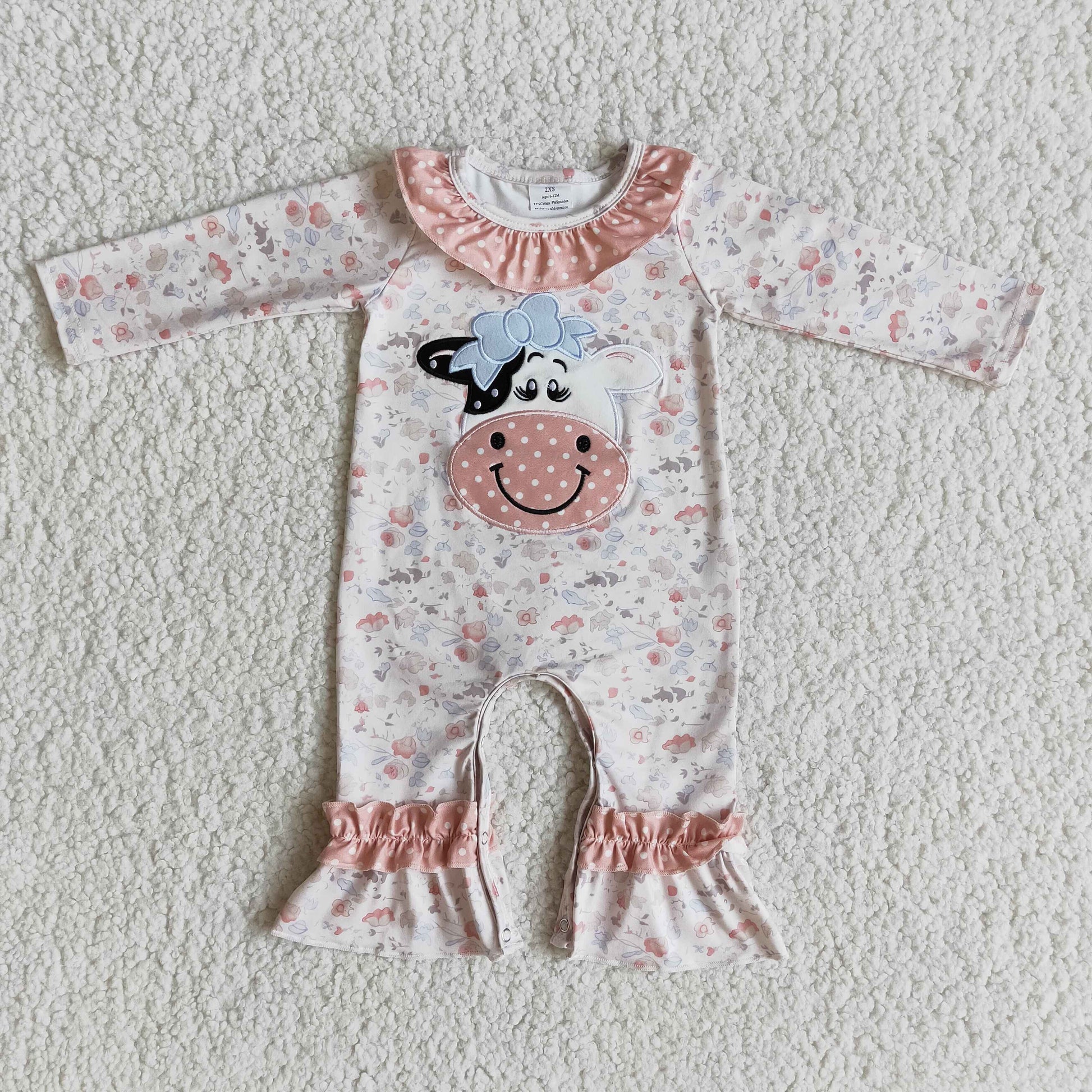 6 A23-5 Cow Flowers Pink Long Sleeve Girls Romper