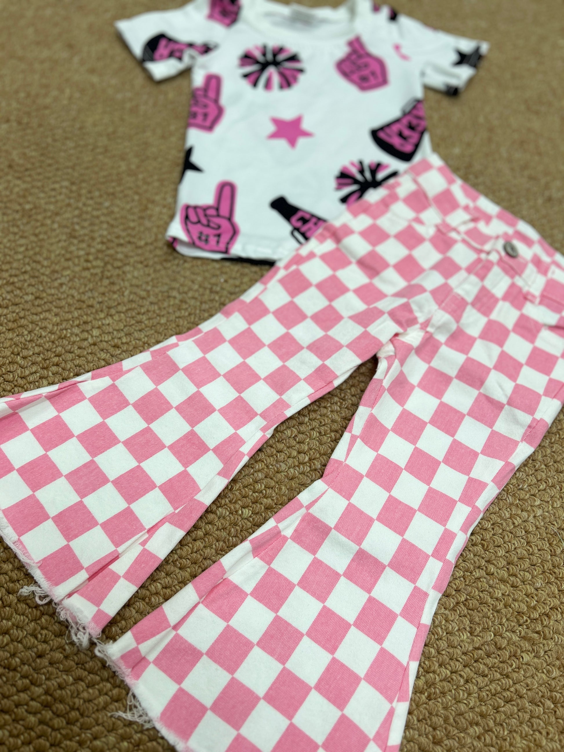 Cheer star hot pink short sleeve pink checkered jeans girls set