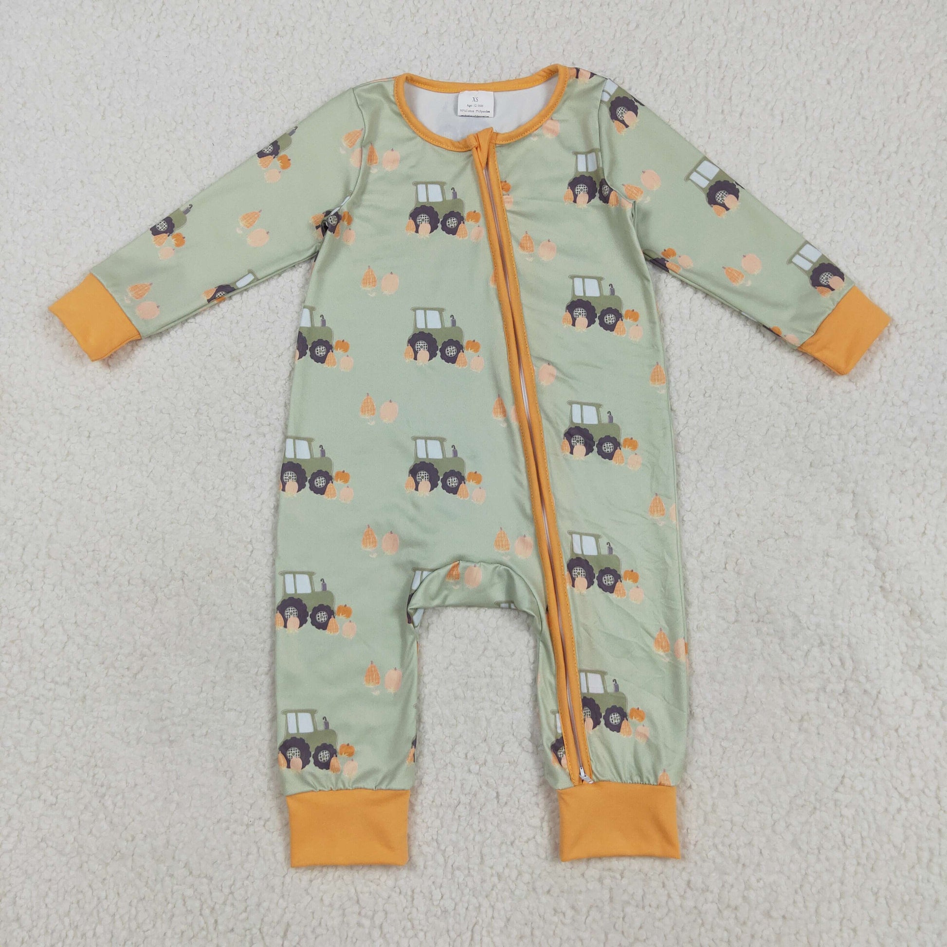 Custom moq 20 bamboo Autunm farm tractor pumpkin green zipper long sleeve boys romper