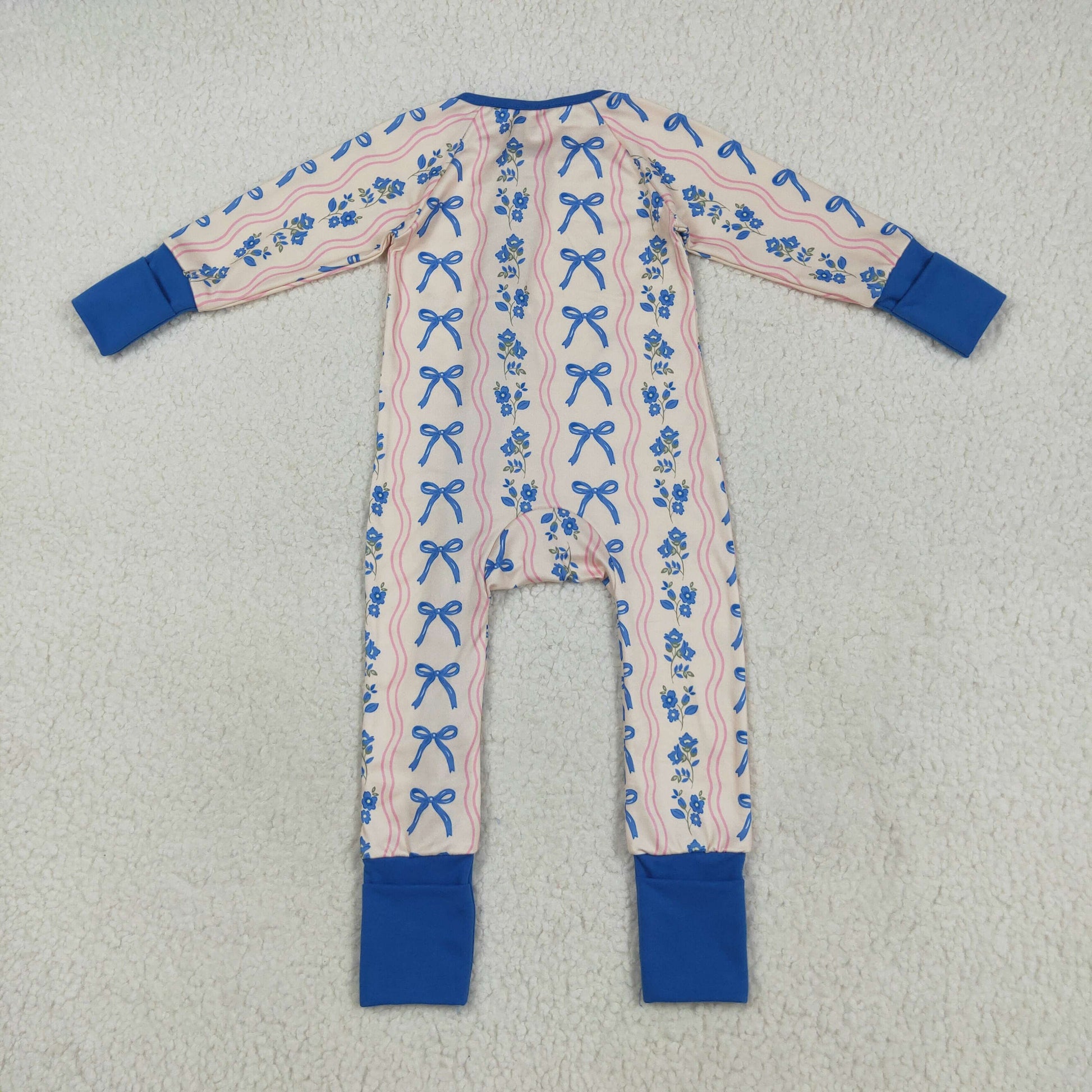Custom moq 20 bamboo blue flowers bows long sleeve zipper girls romper
