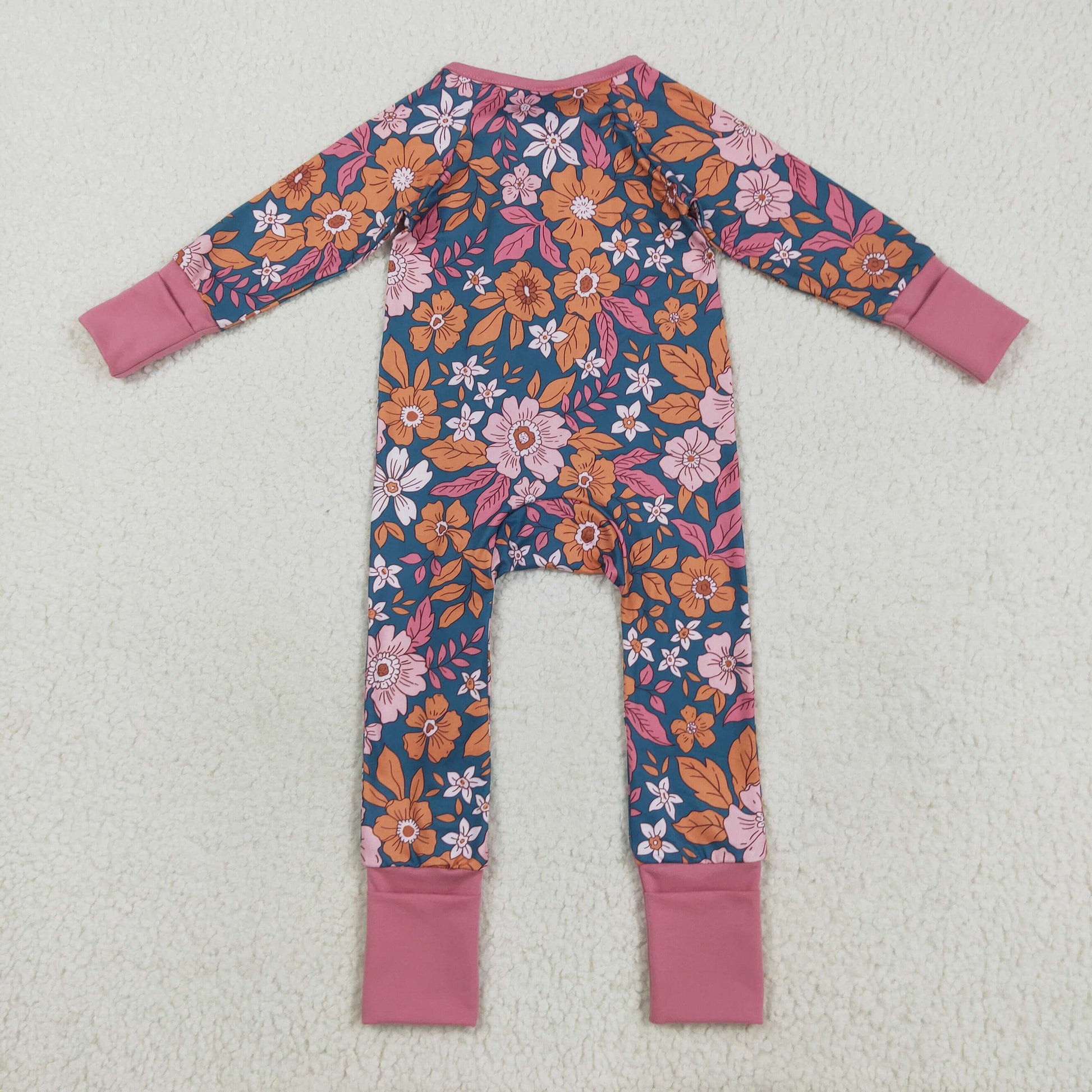 Custom moq 20 bamboo colorful flowers pink zipper long sleeve girls romper