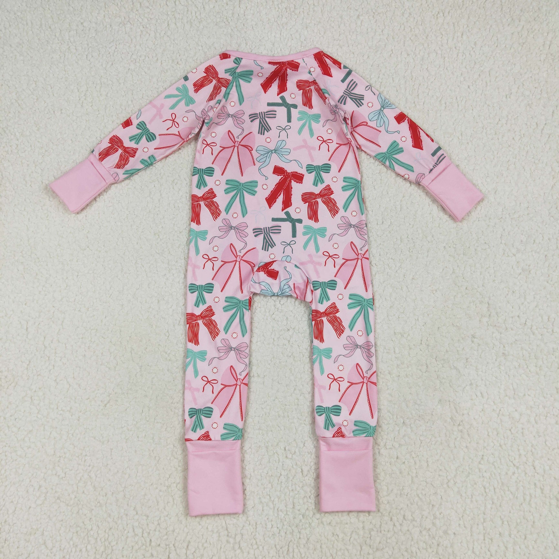 Custom moq 20 bamboo red green bows pink long sleeve zipper girls romper