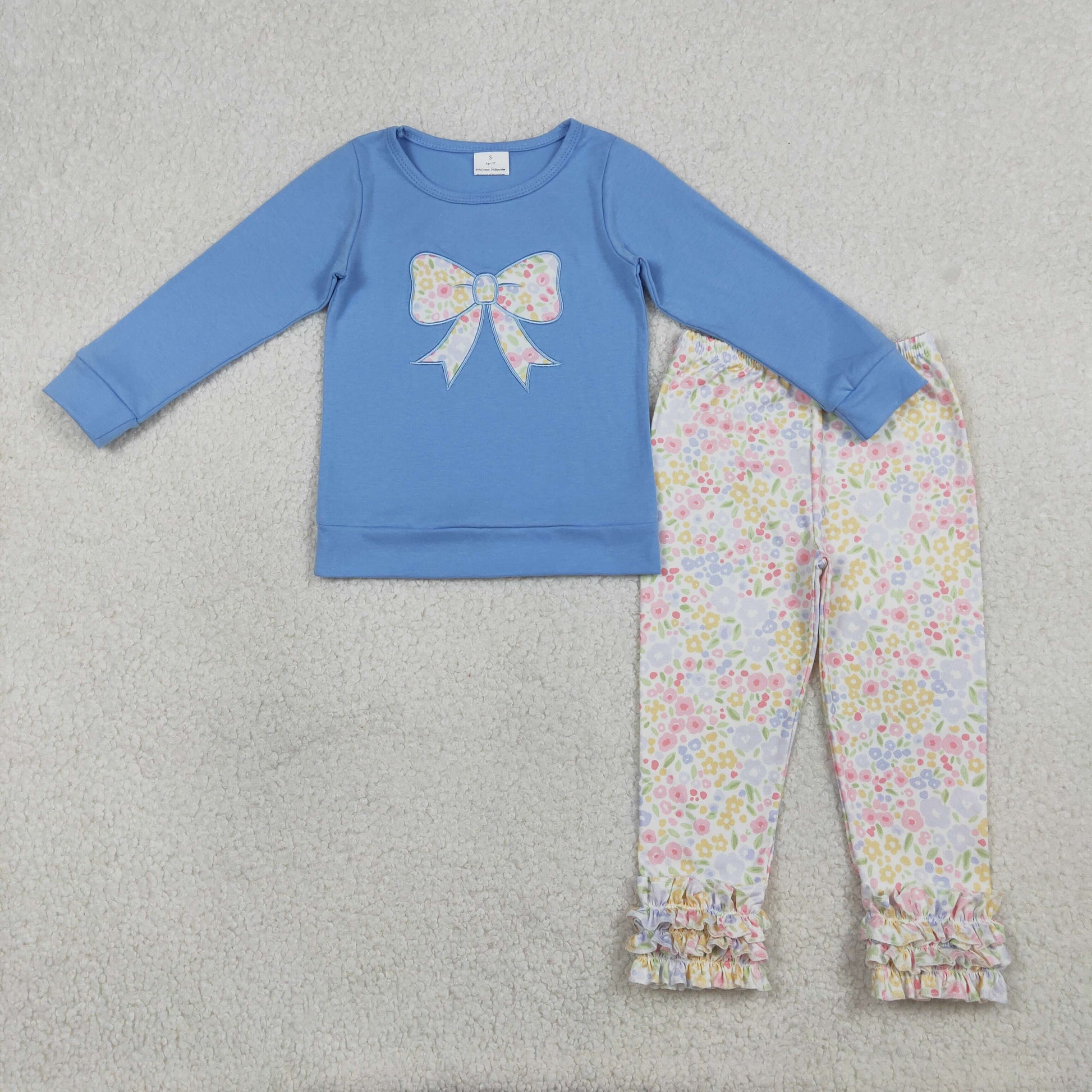 Embroidery GLP3243 Bow Blue Long Sleeve Colorful Flowers Floral Pants Girls Set