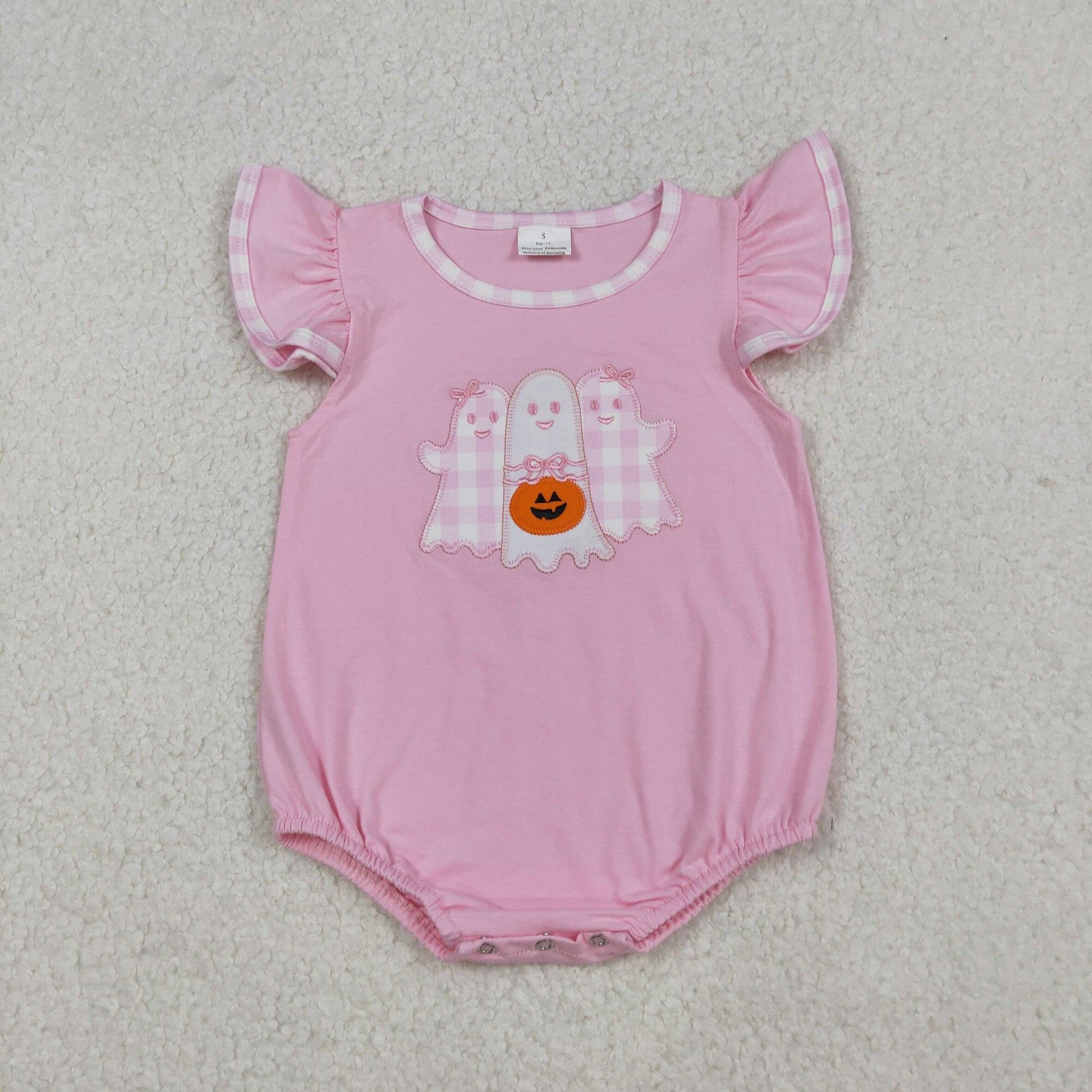 embroidery SR3196 Halloween spooky smile pumpkin pink flutter sleeve girls romper