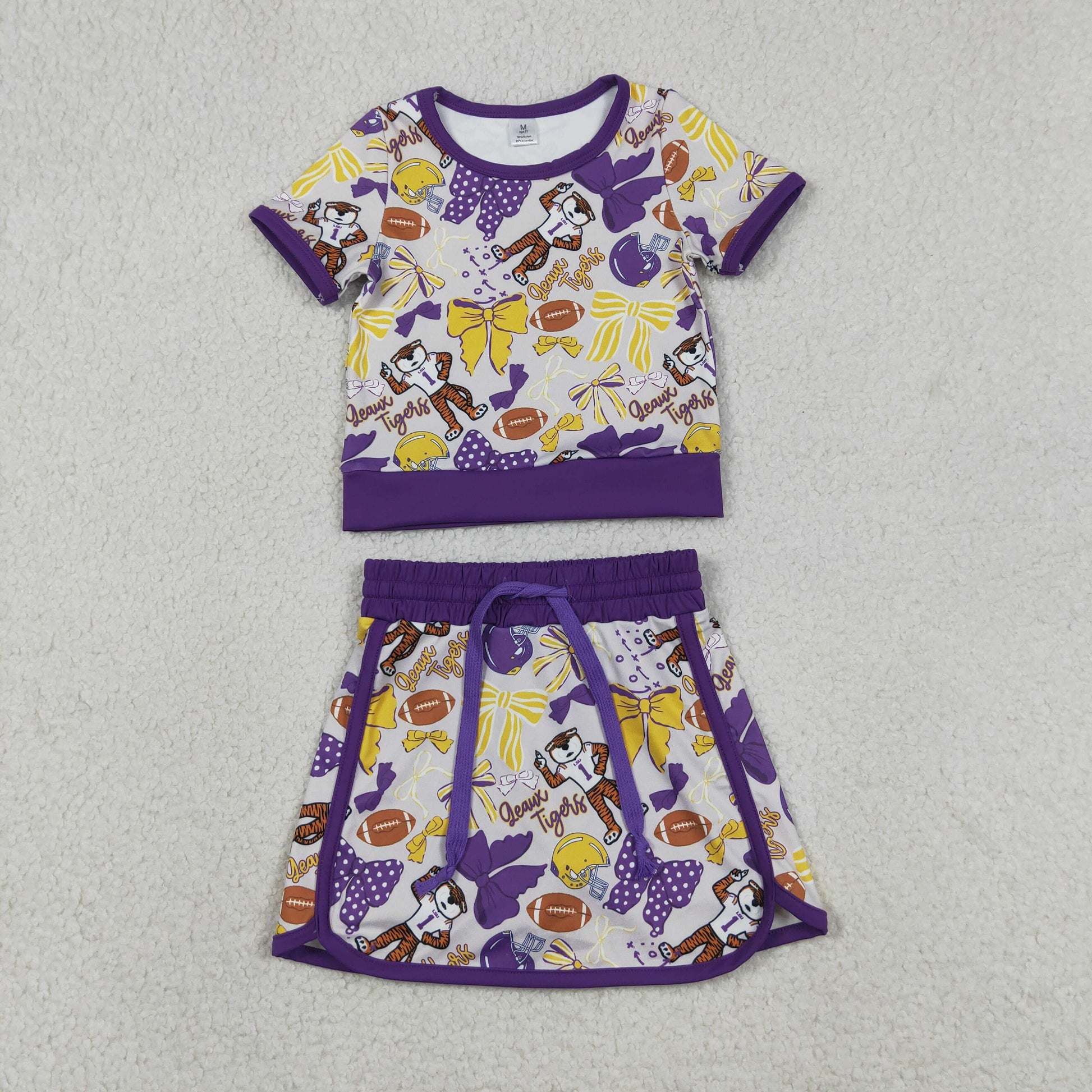 GSD3695 Yoga Football Item Bows Purple Sleeveless Skorts Girls Set
