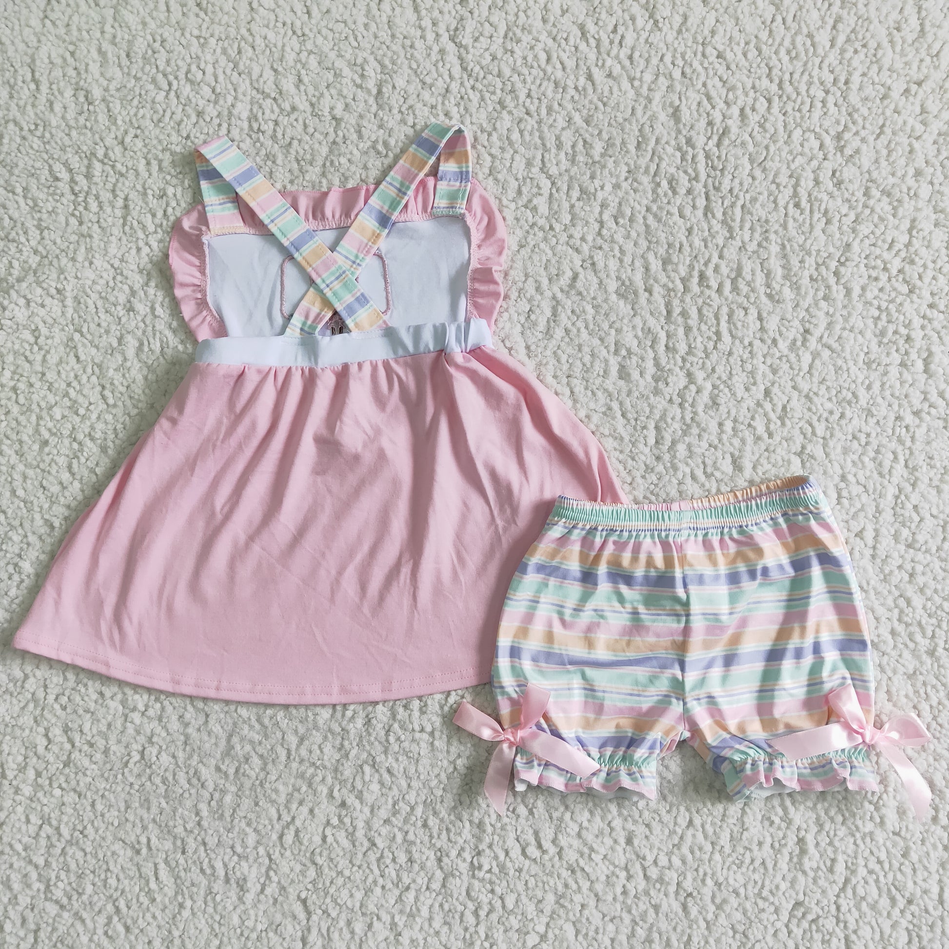 GSSO0012 Popsicle Embroidery Pink Summer Striped Print Girls Set