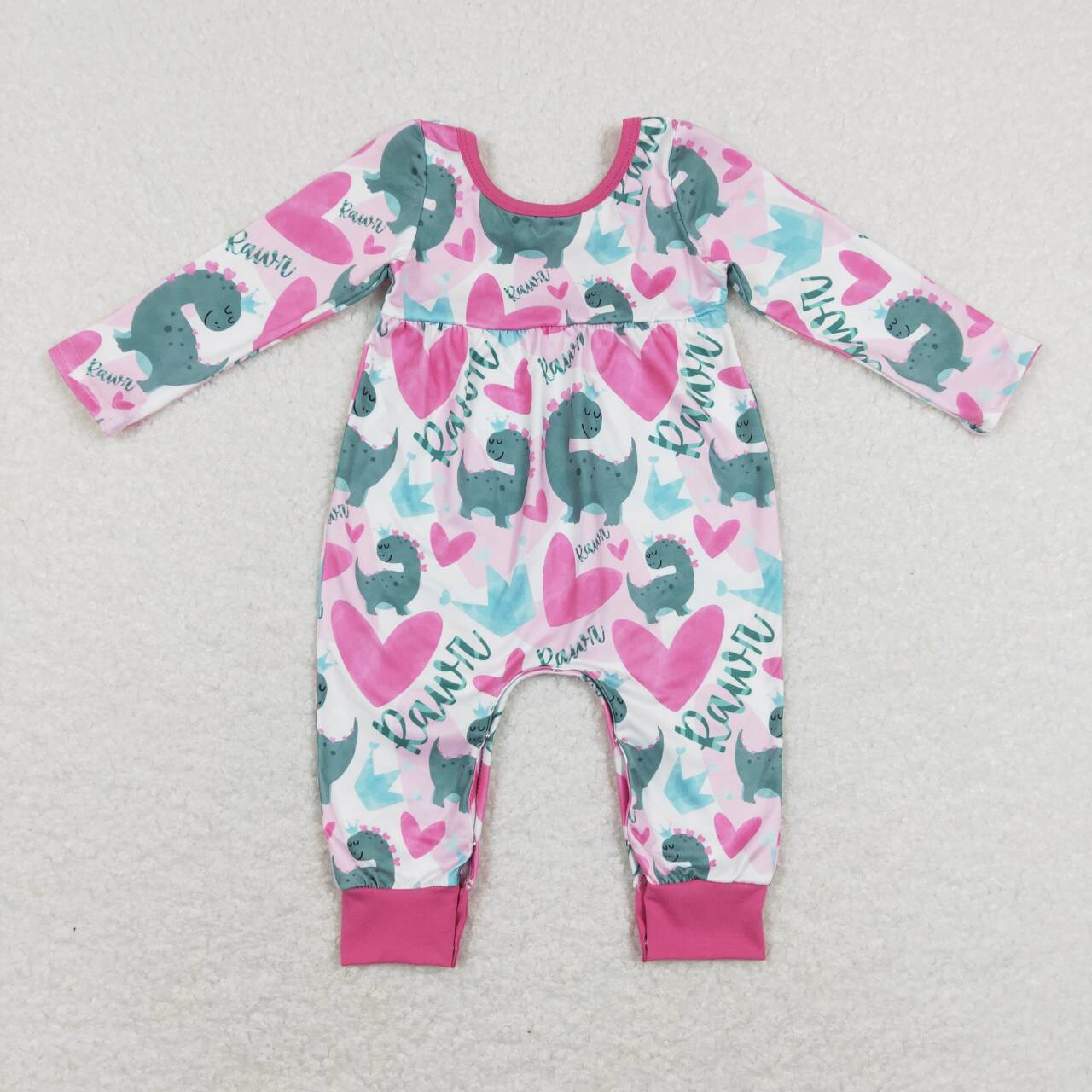 LR0877 Valentine's Day Dinosaur Heart Hot Pink Long Sleeve Girls Romper