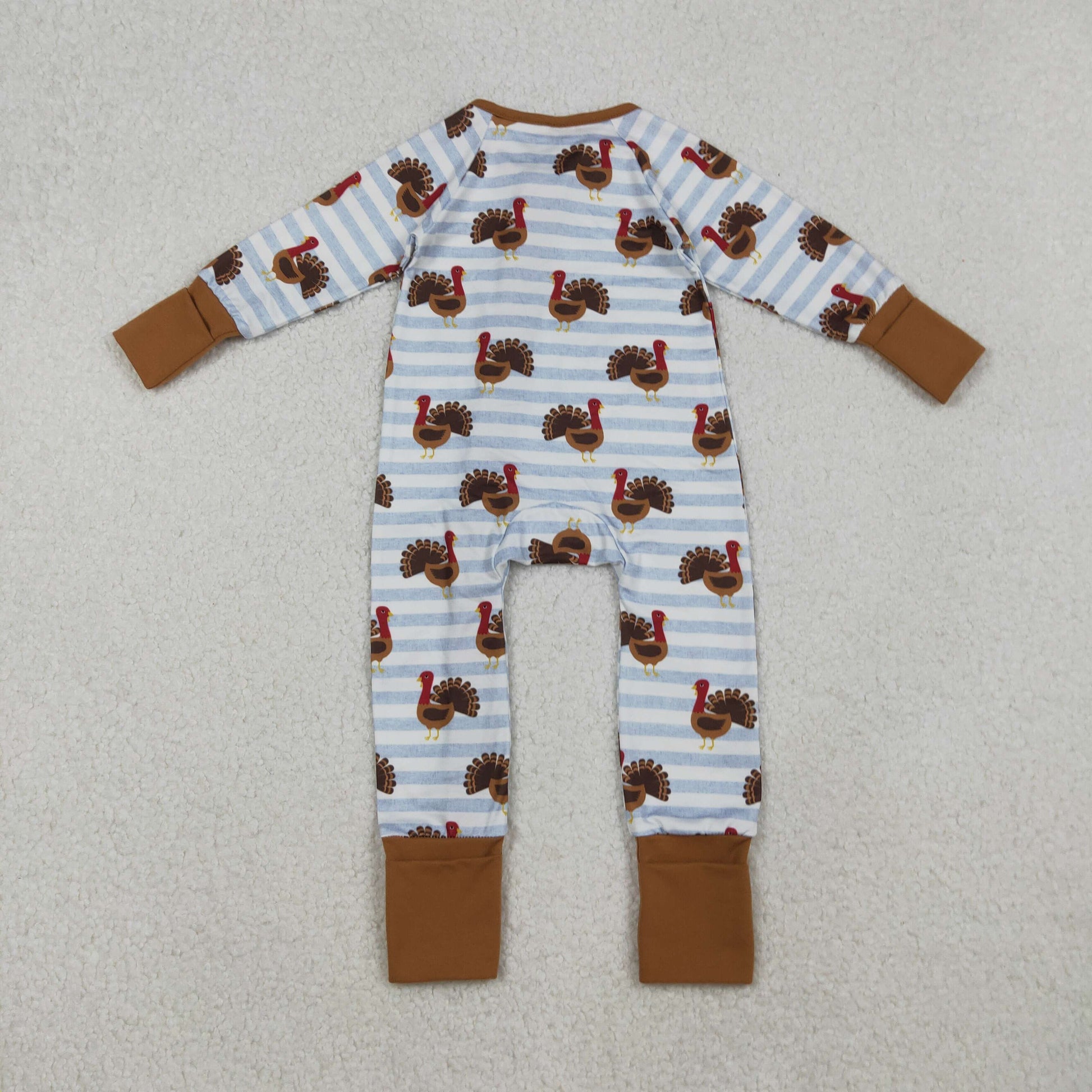 LR1191 Thanksgiving turley blue striped brown zipper long sleeve boys romper