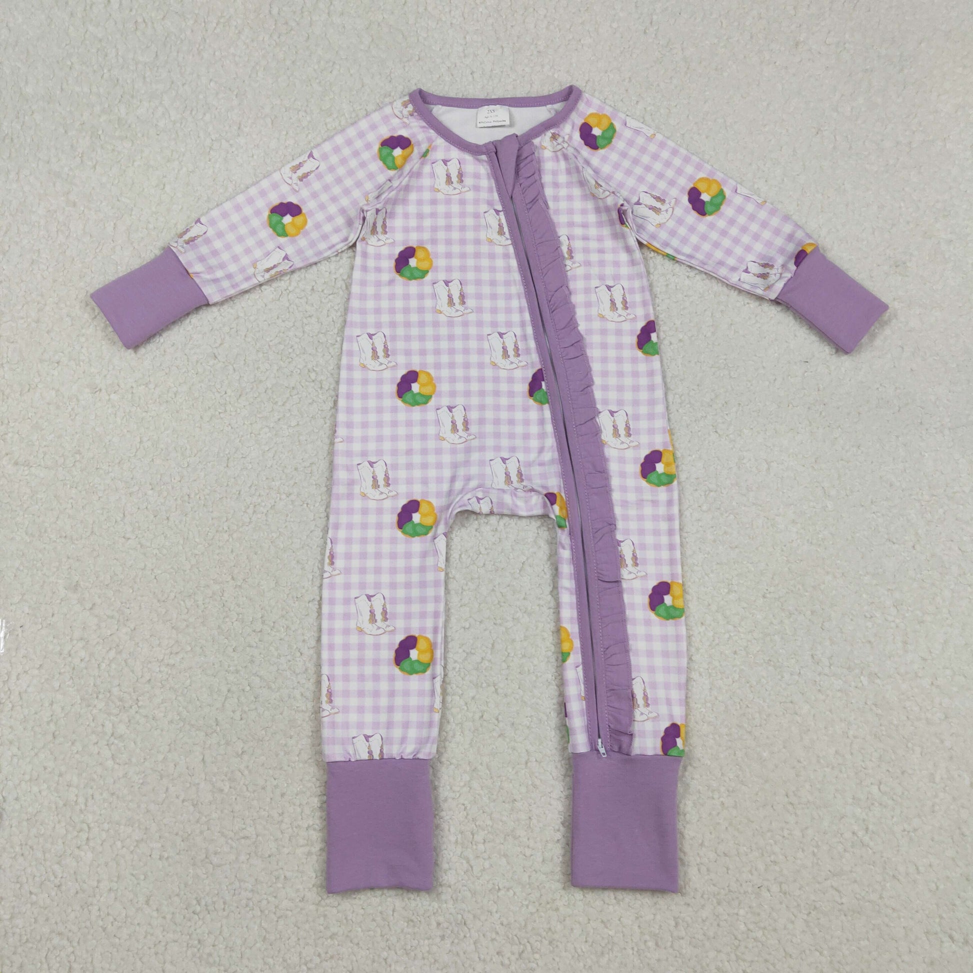 LR2783 Mardi Gras dount purple checkered long sleeve zipper girls romper