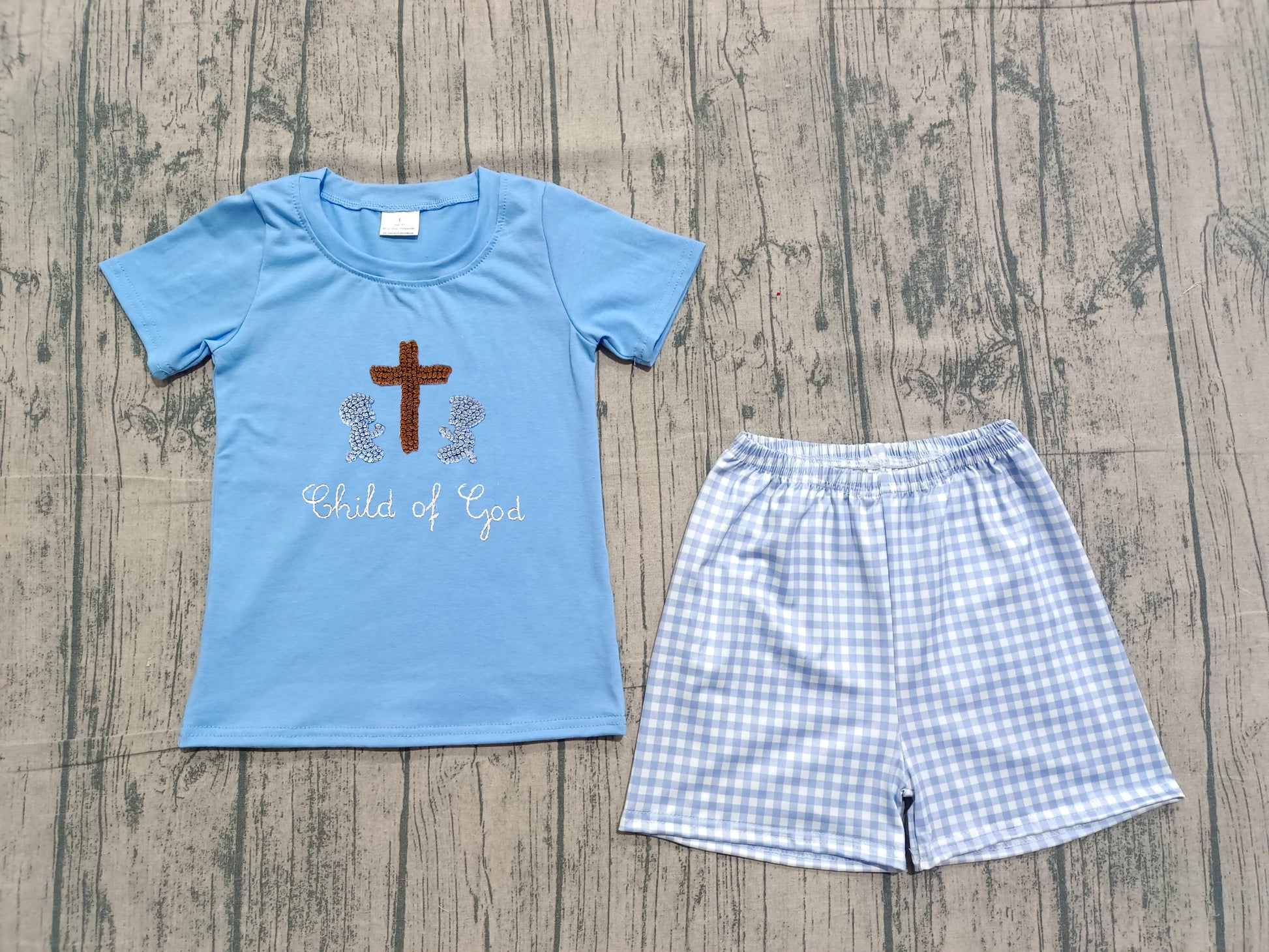 preorder Samples BSSO1714 Easter Cross Child Of God Blue Short Sleeve Checkered Shorts Boys Set