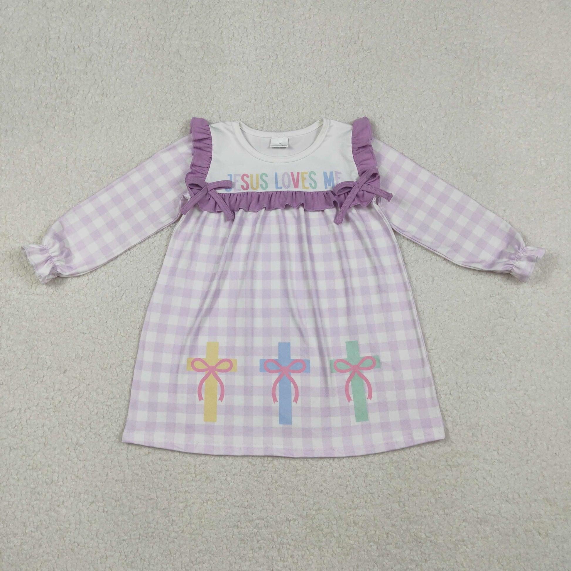 GLD1356 Easter Jesus love me cross bows purple checkered long sleeve girls dress