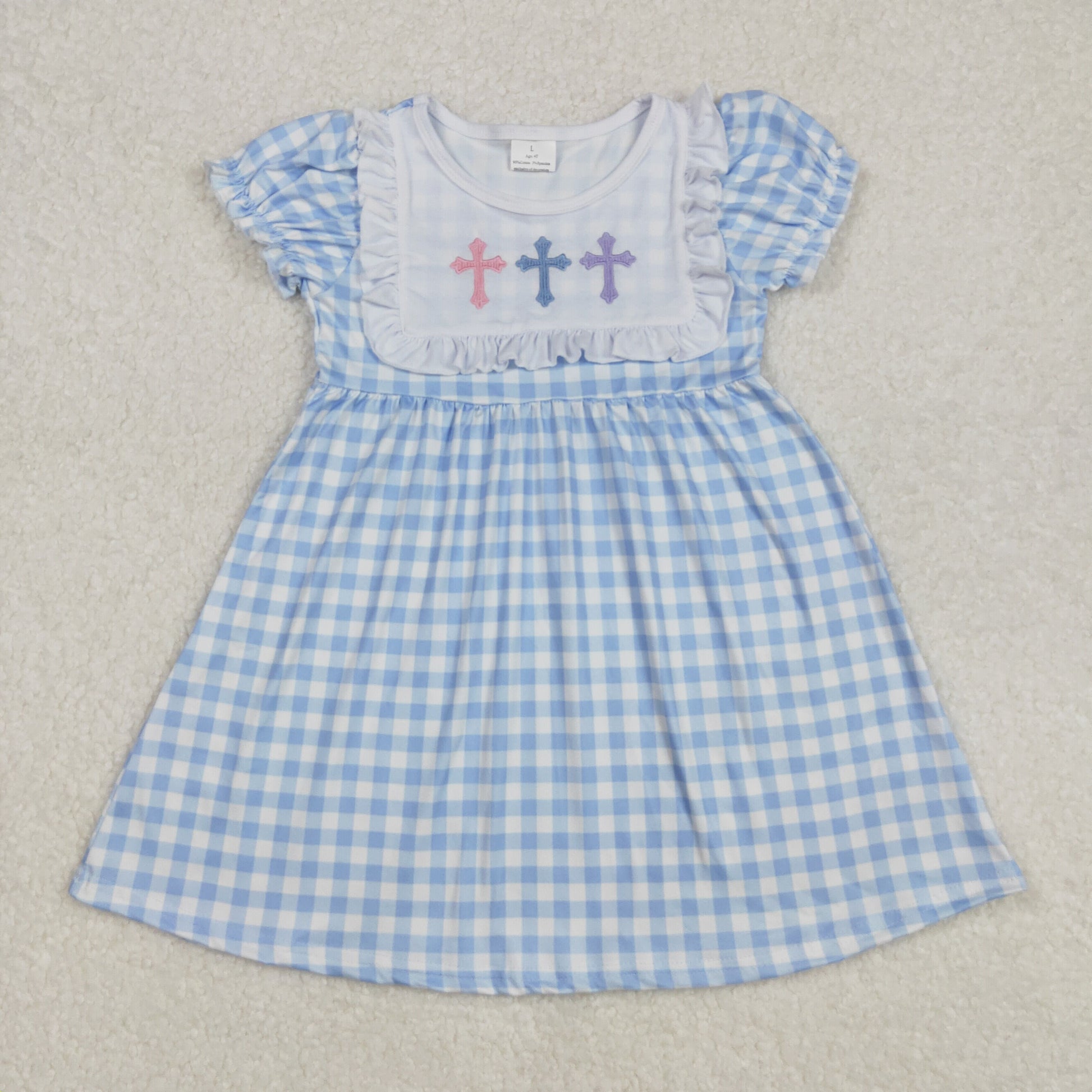 embroidery GSD1522 Easter cross blue checkered short sleeve girls dress