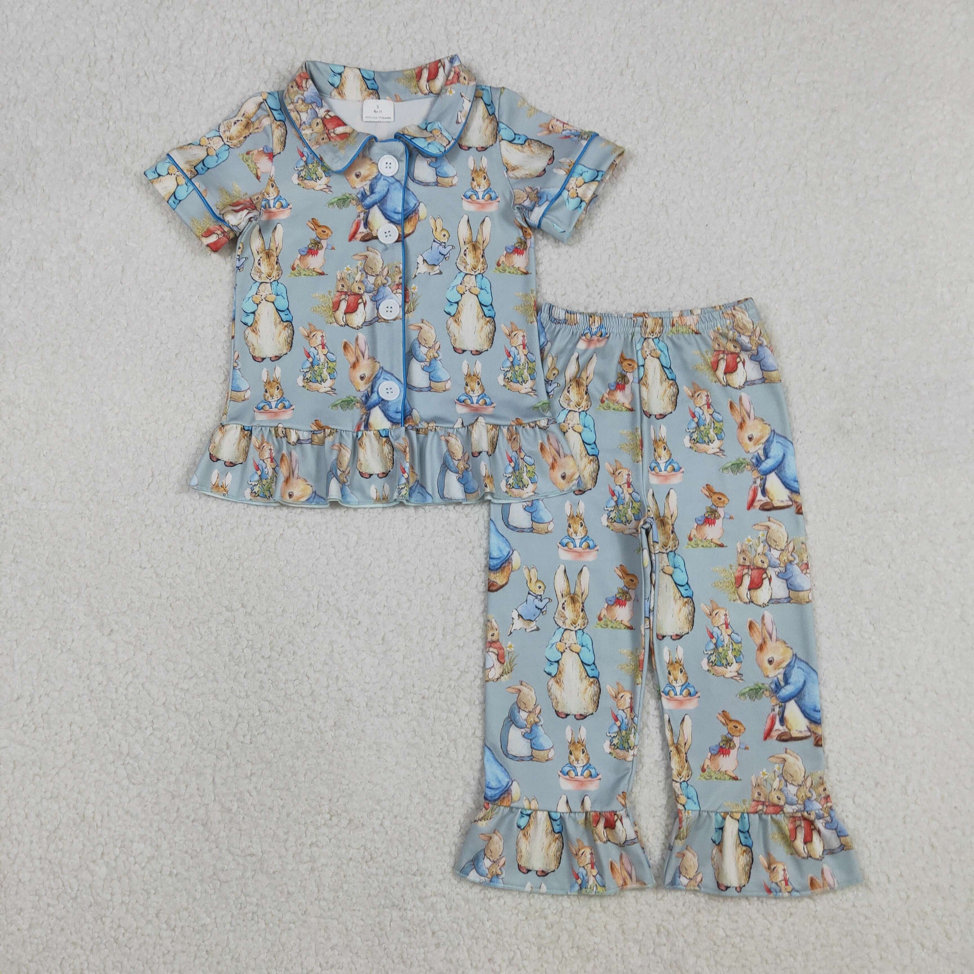 GSPO2097 Easter bunny rabbit blue short sleeve pants girls pajamas