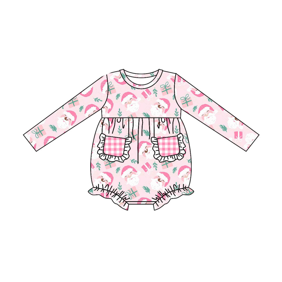 preorder LR1019 Christmas Santa pink pockets long sleeve girls romper