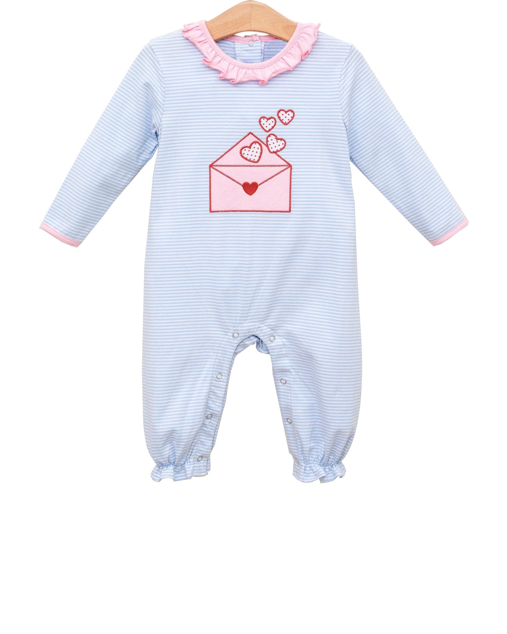 preorder LR2972 Valentine's Day Heart Blue Striped Long Sleeve Girls Romper