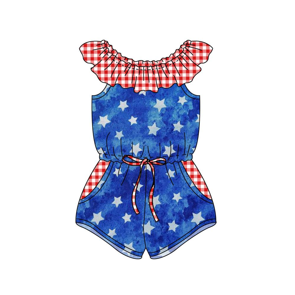 preorder SR1506 July 4th star blue red checkered flutter sleeve girls jumpsuits