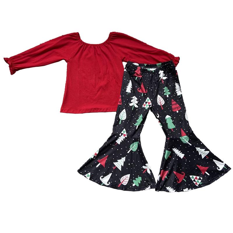 6 A24-5 Red Off Shoulder Casual Top Match Christmas Tree Print Bell-bottom Pants Sets